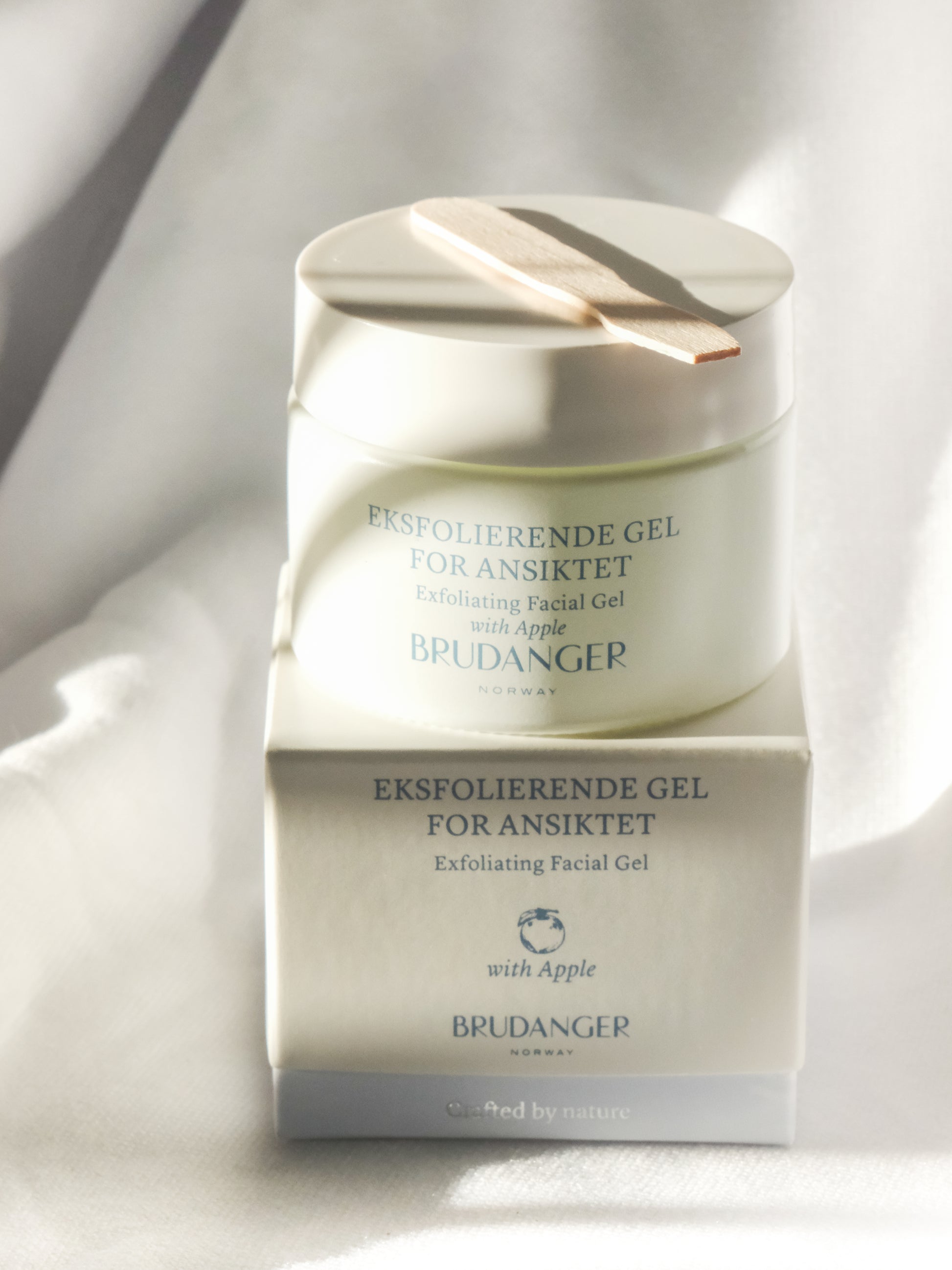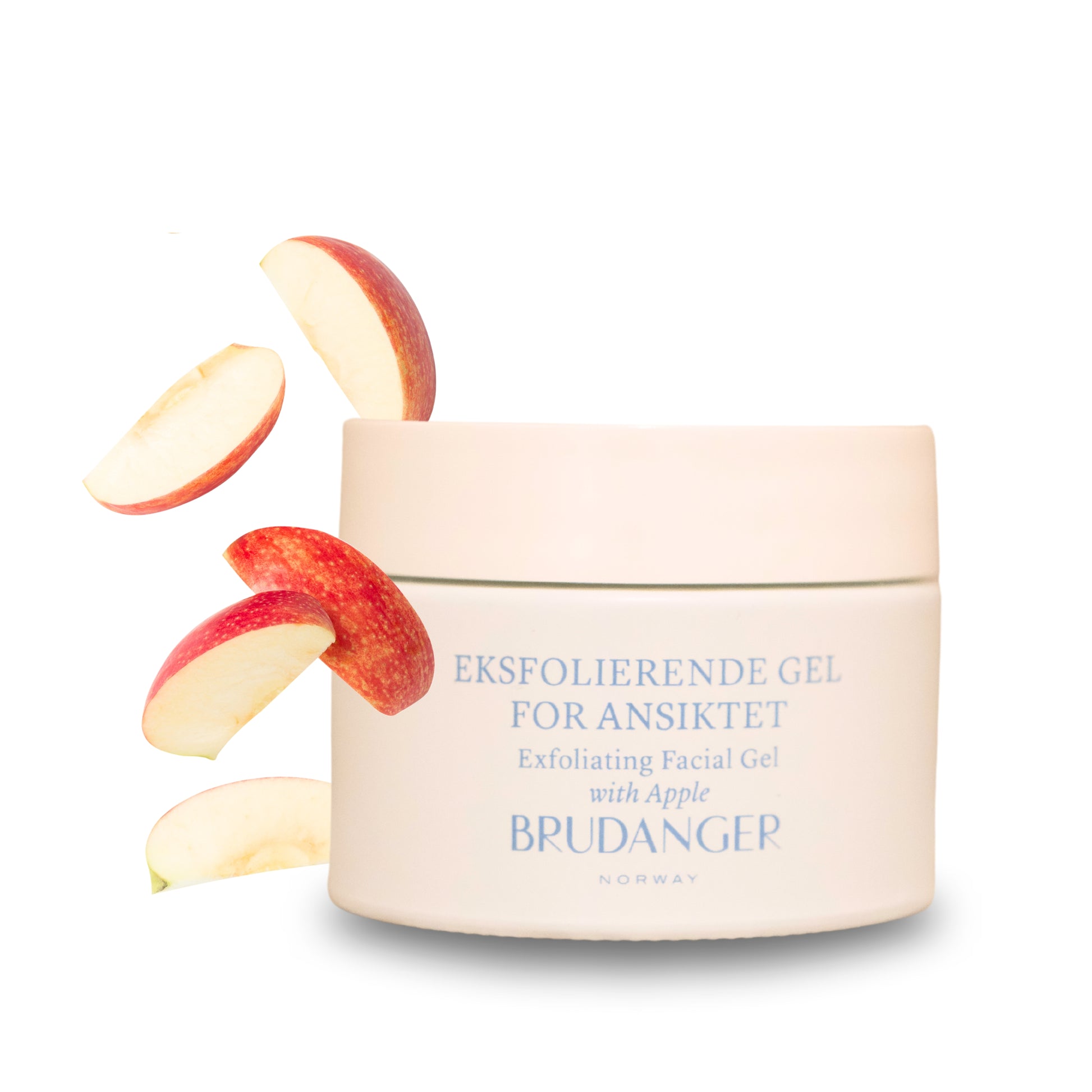 Eksfolierende gel for ansiktet er beriket med eplefrøolje som virker forfriskende på huden, mens planteoljer fra acai og gresskarfrøolje gir næring til huden og gjør den myk. Eksfolierende korn fra bambus er miljøvennlige alternativer til plastkuler og gir en skånsom, men effektiv peeling av ansiktet og stimulerer cellefornyelsen. Huden får en strålende glød. Eksfolierende gel for ansiktet har en ren og frisk planteduft.
